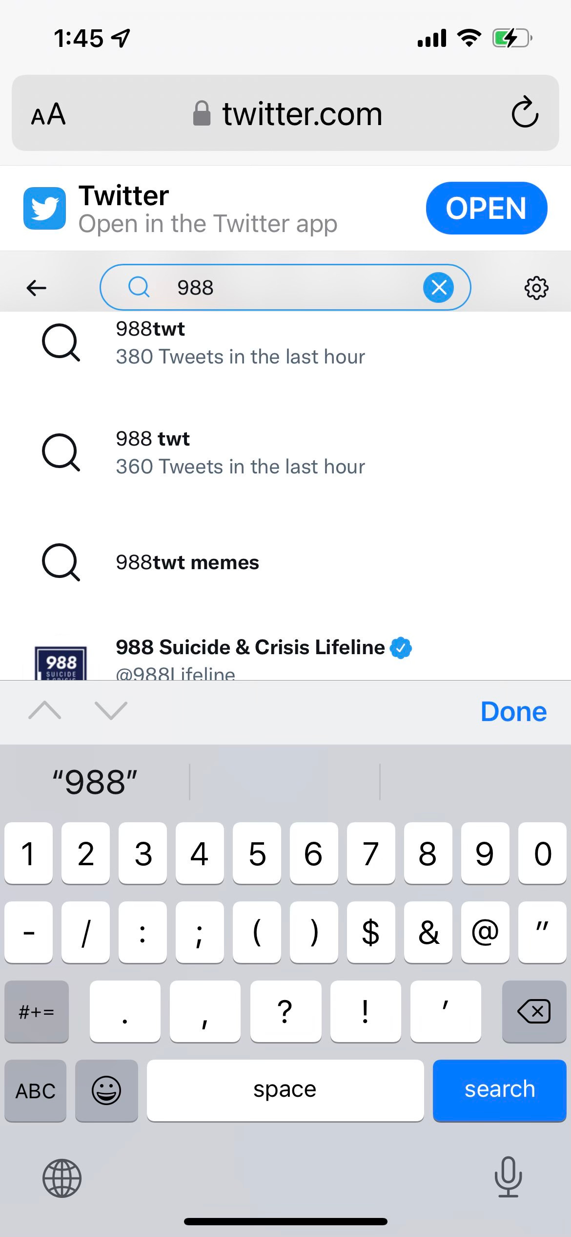 Putting “988” in the Twitter search bar now calls up not just the help-line, but self-harm posts and memes. And these appear in the search results above the 988 Suicide & Crisis Lifeline.