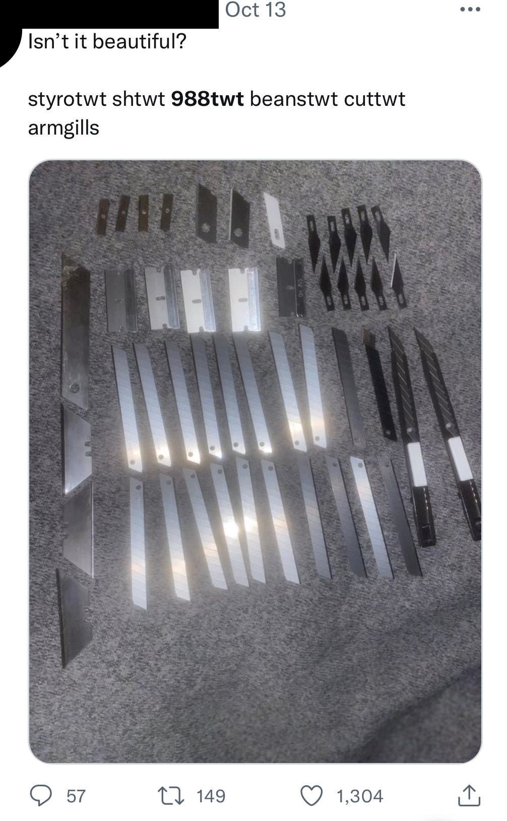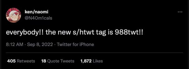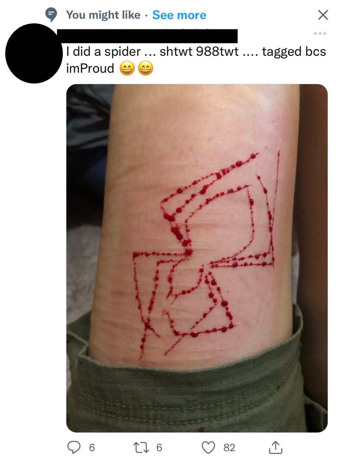 Soon after Twitter began showing the 988 helpline at the top of shtwt search results, “988twt” became a new and popular self-harm search term, tweeted hundreds of times per hour to tag horrific self-harm posts — including the one I screencapped (which was tagged with 988twt, shtwt, beanstwt, fasciatwt, bloodtwt, and scartwt).