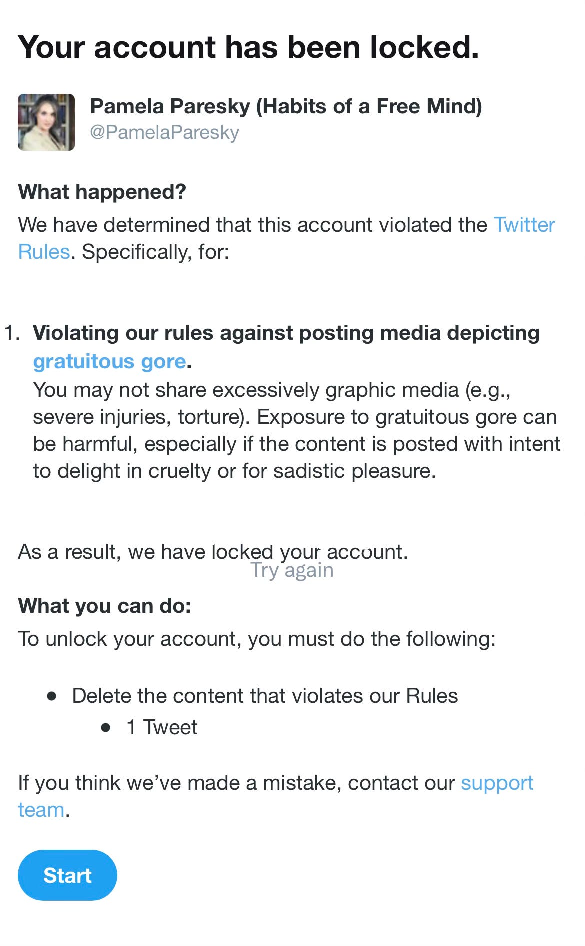 In response, Twitter locked me out of my account (@PamelaParesky). They claimed I violated the same “gratuitous gore” policy I criticized them for not taking seriously. I am now using a new account (@PareskyPamela) while I await a resolution.