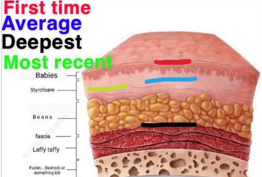 In our paper, we describe coded search-terms: “babies” for the lightest cutting and “beans” for cutting down to the subcutaneous layer. (The image below explains codewords for depth.) Simpler terms like “gore,” “gory,” “blood,” “scars”… etc. are also used. Other coded terms refer to the way the injuries look. For example, “catscratch,” “raspberryfilling,” “barcode,” and “armgills.” All of these terms are often appended with “twt.”